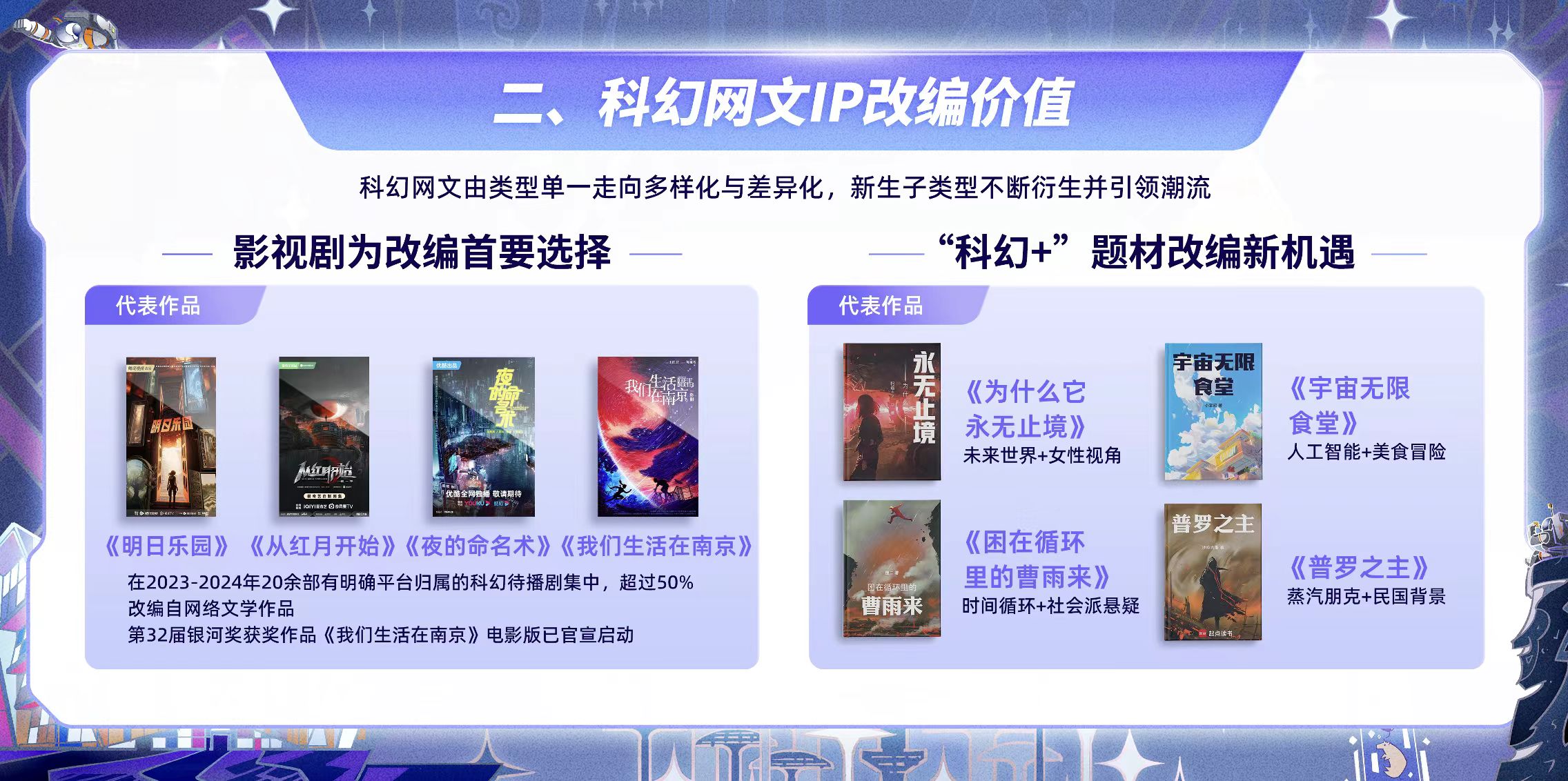 科幻網(wǎng)文題材的百花齊放,也促使其IP改編價值加速釋放。白皮書認為,受益于網(wǎng)絡文學的大眾性、消費性,以及科幻題材的現(xiàn)實性,科幻網(wǎng)文天然具有IP改編的強大潛力。據(jù)統(tǒng)計,2023-2024年,20余部有明確平臺歸屬的科幻待播劇集中,超過50%改編自科幻網(wǎng)文。根據(jù)閱文科幻網(wǎng)文改編的影視劇《明日樂園》《從紅月開始》《夜的命名術》等出現(xiàn)在各大視頻平臺片單中。同時,由導演路陽執(zhí)導的電影項目《我們生活在南京》一經(jīng)官宣,也引發(fā)影視文化行業(yè)及科幻愛好者的廣泛關注。