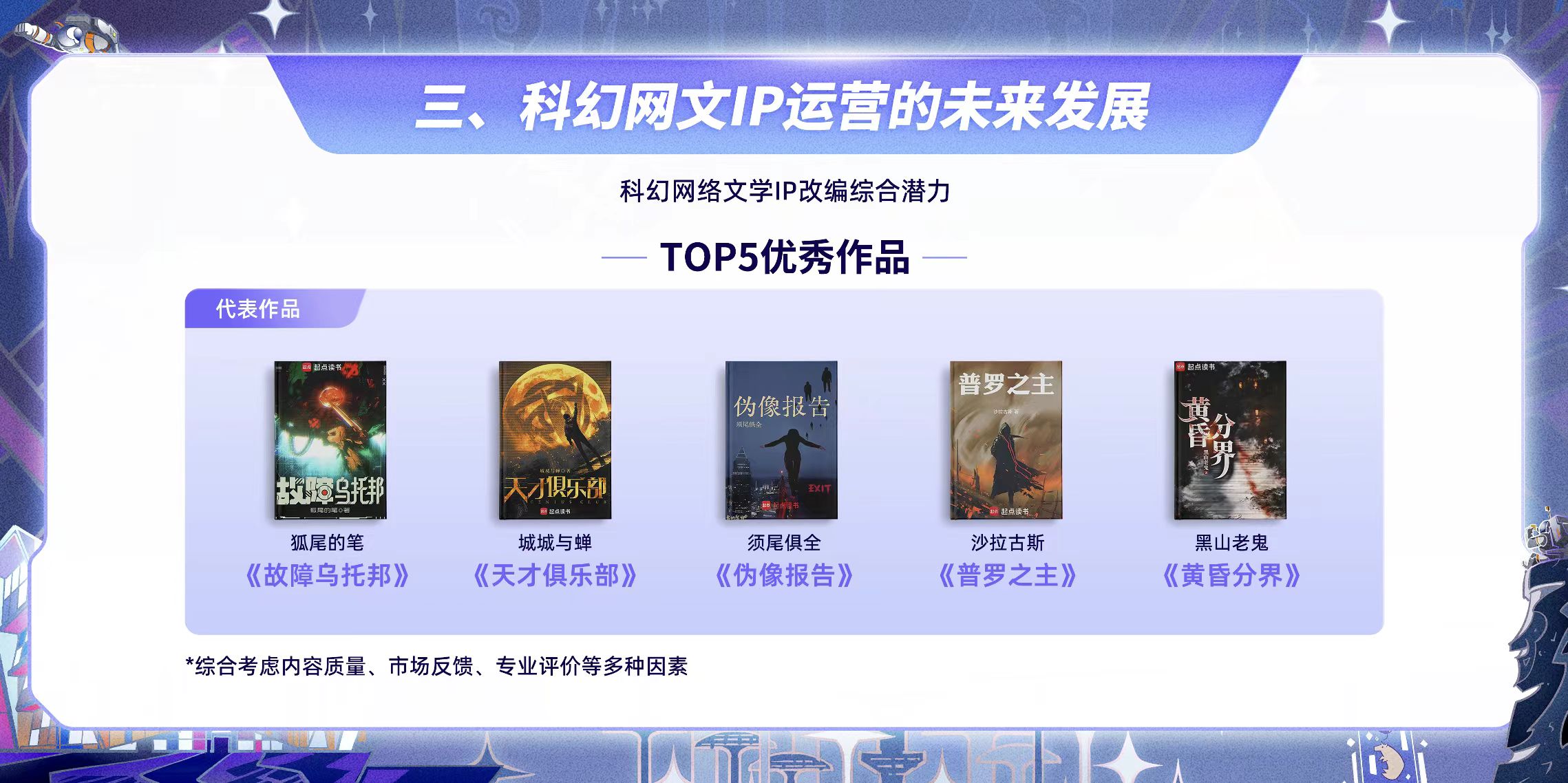 科幻網(wǎng)文優(yōu)質作品的IP改編化,是中國網(wǎng)絡文學做大做強的關鍵環(huán)節(jié)。綜合考慮內容質量、市場反饋、專業(yè)評價等多種因素,白皮書認為,《故障烏托邦》《天才俱樂部》《偽像報告》《普羅之主》《黃昏分界》等5部網(wǎng)絡文學作品具備較強的IP改編潛力。其中,本屆銀河獎最佳科幻網(wǎng)絡文學獎獲獎作品《天才俱樂部》影視化項目已在積極推進中。