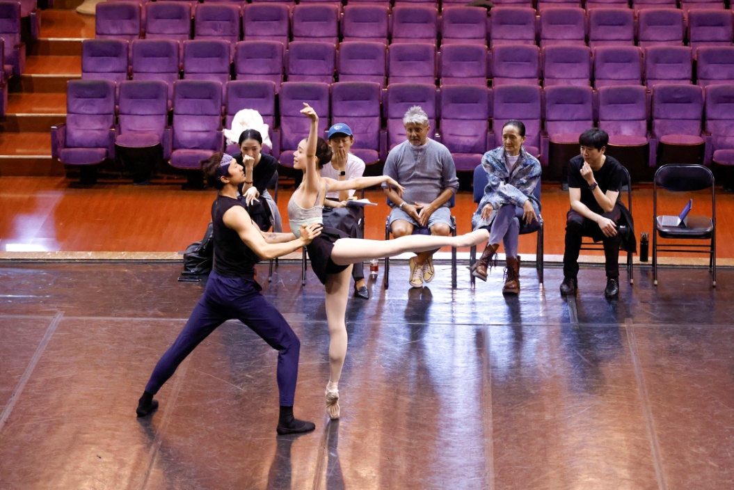 中央芭蕾舞團團長馮英與《蝙蝠》執(zhí)行監(jiān)督路易吉·博尼諾指導(dǎo)演員排練