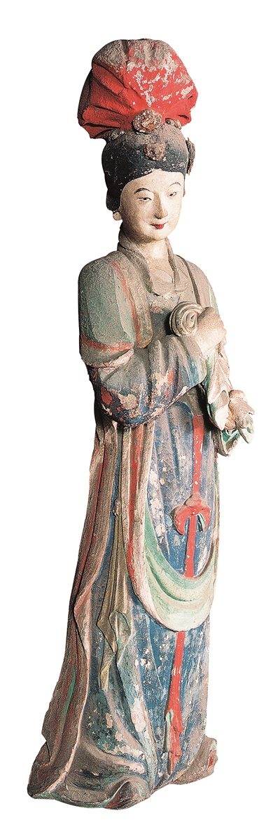 圣母殿內(nèi)完整保存了43尊彩繪泥塑。圣母邑姜像頭戴鳳冠,霞帔珠纓,端莊高貴。42尊侍從像對(duì)稱分列于圣母神龕兩側(cè),有的奉文印翰墨,有的灑掃梳妝、奏樂歌舞。這組塑像寫實(shí)傳神,對(duì)研究宋代宮廷生活、衣冠服飾和彩塑藝術(shù)具有重要價(jià)值。