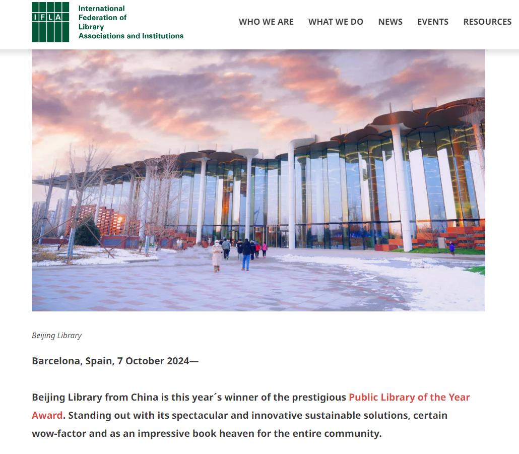 北京城市圖書館榮獲國際圖聯(lián)(IFLA)2024年度公共圖書館獎(jiǎng)