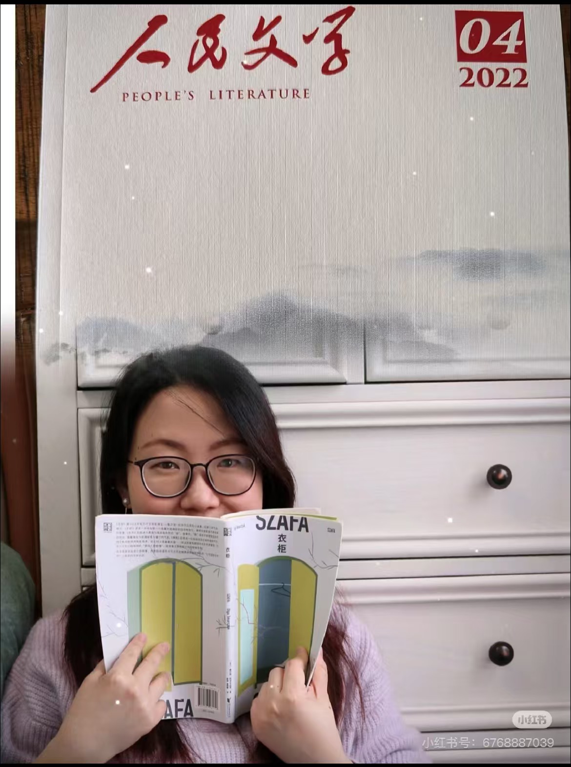 關(guān)注到龔萬(wàn)瑩是在某天刷小紅書(shū)時(shí),偶然看見(jiàn)一篇標(biāo)題為“積累了30萬(wàn)字后,我終于登上《人民文學(xué)》啦!”的帖子,封面圖是一個(gè)戴著黑框眼鏡、眼角含笑的女孩,手中一本名為《衣柜》的書(shū)遮住了半個(gè)清秀面龐。她背靠著一個(gè)衣柜,衣柜上方則是當(dāng)期《人民文學(xué)》封面。