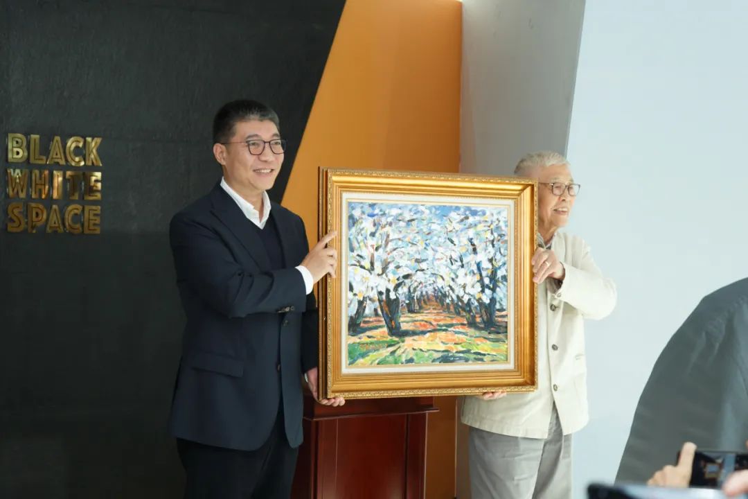 發(fā)言儀式后,鐵揚(yáng)先生向母校捐贈畫作及十七種畫冊和文學(xué)類書籍。院長郝戎為鐵揚(yáng)先生頒發(fā)捐贈證書、佩戴?;?。諸迪宣布展覽開幕。隨后,全體與會領(lǐng)導(dǎo)、嘉賓到展廳內(nèi)參觀藝術(shù)展,并開展交流。