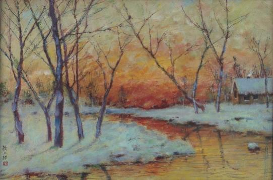 《晚霞雪景》顏文樑 22×33cm 木板油畫 1975年 中國美術(shù)館藏