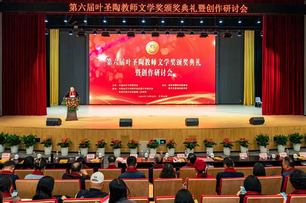 10月28日,葉圣陶先生誕辰130周年之際,第六屆葉圣陶教師文學獎頒獎典禮在蘇州吳中區(qū)甪直鎮(zhèn)舉行,同時舉辦了教師文學創(chuàng)作研討會。中國當代文學研究會名譽會長、中國社科院研究員白燁,中國當代文學研究會原副會長、首都師范大學文學院教授吳思敬,人民教育出版社編審顧之川,中國當代文學研究會副會長、中國社會科學院研究員陳福民,山東省作家協(xié)會主席團委員、《青島文學》主編李林芳,中國當代文學研究會校園文學委員會常務副理事長兼秘書長王世龍,中國當代文學研究會校園文學委員會副理事長、特級教師尤立增,吳中區(qū)人民政府副區(qū)長朱筱菁,甪直鎮(zhèn)黨委書記姜昊、鎮(zhèn)長朱華平,吳中區(qū)教育局副局長程朝陽,甪直鎮(zhèn)黨委委員張春茂、張杰峰,甪直葉圣陶研究中心主任周民森、吳中區(qū)星澤實驗學校校長曹云霞等領(lǐng)導、專家出席,葉圣陶先生家屬代表姚兀貞、葉永和、蔣燕燕前來祝賀,來自全國各地的獲獎教師作家及學校、出版社代表及和吳中區(qū)學校老師480余人齊聚一堂,以當下教師的文學創(chuàng)作成果與意義,共同緬懷葉圣陶先生這位“一代師表”的文學精神、教育思想和高尚的人格魅力。吳中區(qū)甪直鎮(zhèn)社會事業(yè)辦公室副主任費玲玲主持了頒獎典禮。