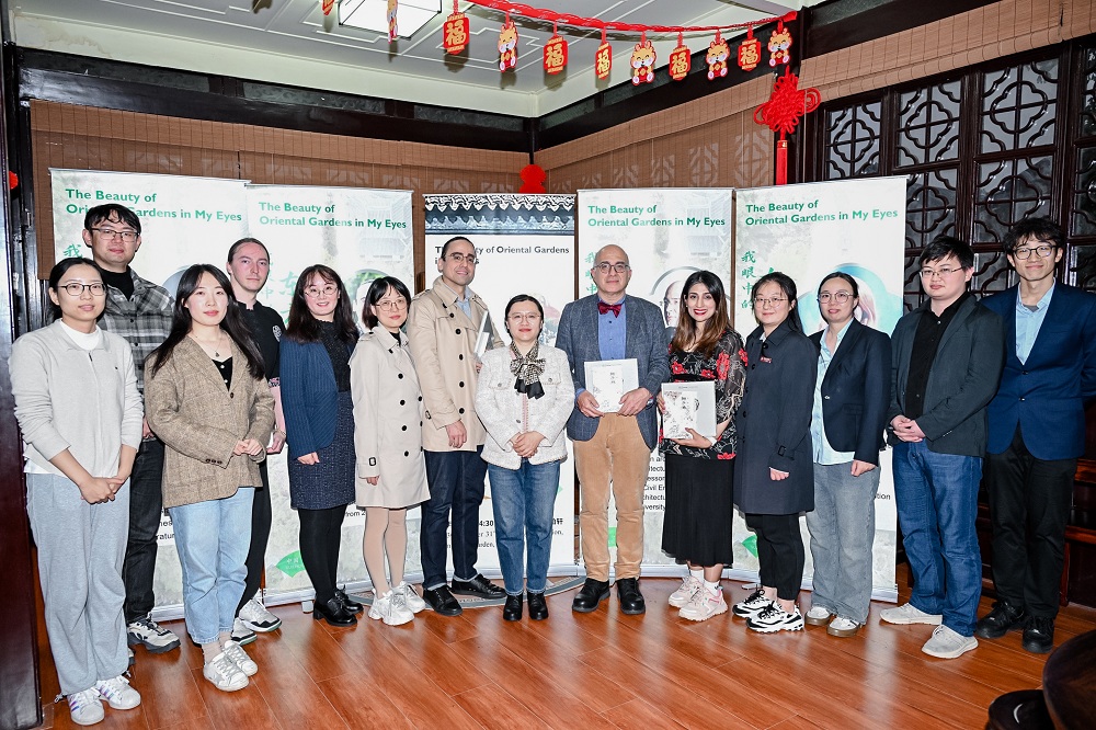活動最后,張婕向四位外賓贈送了由蘇州市獅子林管理處工作人員參與撰寫的圖書《詩畫獅子林》和《獅子林畫冊》,并合影留念。