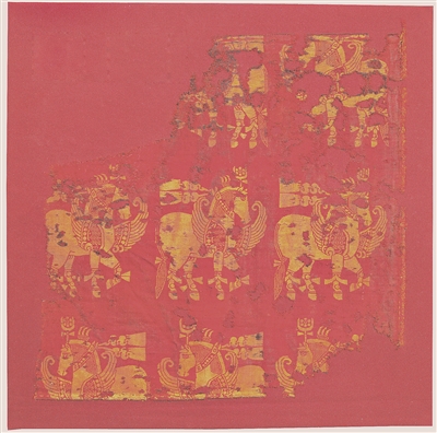 “紅地翼馬紋錦”經(jīng)向長52厘米、緯向?qū)?1厘米,以紅色經(jīng)線為地,米白色緯線以斜紋重組織成翼馬圖案,具有明顯的中亞、西亞風(fēng)格。目前紋錦圖案殘存3排翼馬,中間一排3匹馬右行,上排兩匹(殘損嚴(yán)重)和下排3匹均為左行。馬頭戴花狀冠飾,頸系連珠紋帶,連珠紋帶綴有兩條飄帶,從頸后水平狀飄揚(yáng)。馬胸兩側(cè)生翅,翅上鑲有連珠紋,四足及尾部系縛綢帶結(jié),造型別致,充滿浪漫華貴氣息,是典型的薩珊波斯風(fēng)格。
