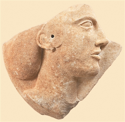 走進展廳,首先映入眼簾的是一塊大理石女性頭像浮雕圓盤殘片。它來自米洛斯島,年代約為公元前460年—前450年,圓盤上刻畫的女性可能是古希臘神話中的美神阿佛洛狄忒。她濃密的頭發(fā)束成一個髻,露出修長的脖頸,散發(fā)著優(yōu)雅之美。