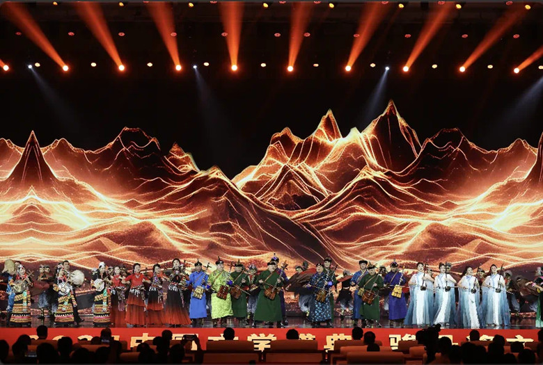 本次盛典將文學(xué)頒獎(jiǎng)典禮與舞臺(tái)表演相結(jié)合,在頒獎(jiǎng)中精心穿插豐富多樣的文藝表演,精選新中國(guó)成立以來的經(jīng)典歌曲、舞蹈、器樂作品進(jìn)行編排,藝術(shù)化地展現(xiàn)了新時(shí)代作家扎根人民、勇攀高峰的昂揚(yáng)面貌。器樂《萬馬奔騰》、舞蹈《銀落舞》、歌曲《光亮》、情景舞蹈《山鄉(xiāng)巨變看今朝》、歌曲《愛我中華》《多謝了》等節(jié)目民族特色鮮明、時(shí)代氣息濃郁,有力彰顯了中華民族多元一體、團(tuán)結(jié)統(tǒng)一的鮮明底色?,F(xiàn)場(chǎng)還播放了分別以凡一平、柳客行、艾布及上屆全國(guó)少數(shù)民族文學(xué)創(chuàng)作駿馬獎(jiǎng)獲得者紅日為主角的三個(gè)視頻短片,以影像的方式展現(xiàn)作家形象,深入挖掘獲獎(jiǎng)作家的心路歷程及其作品背后的感人故事。盛典還將莊重典雅的大型文學(xué)頒獎(jiǎng)典禮與氣氛熱烈、形態(tài)豐富、傳播力強(qiáng)的電視晚會(huì)和網(wǎng)絡(luò)平臺(tái)直播充分融合,面向全社會(huì)展現(xiàn)新時(shí)代民族文學(xué)欣欣向榮的發(fā)展態(tài)勢(shì),最大程度拓展文學(xué)“朋友圈”,讓文學(xué)進(jìn)一步破圈跨界傳播。