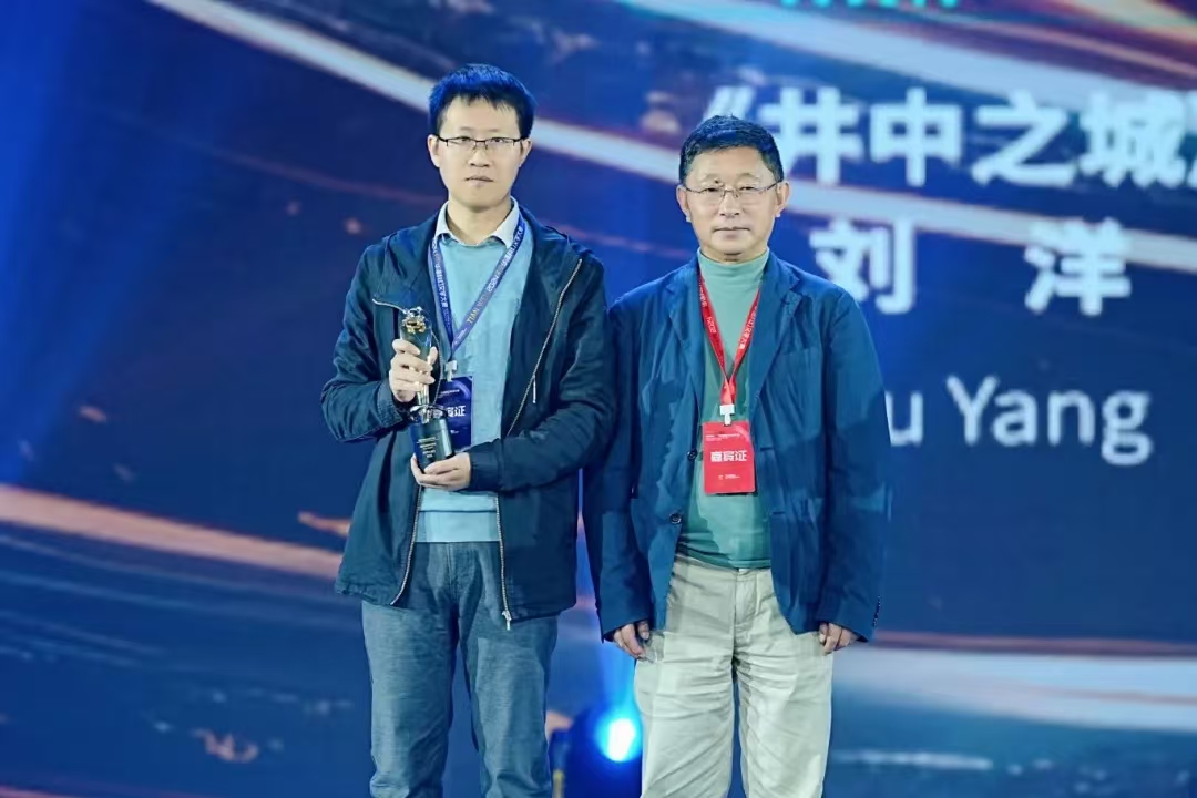 中國作協(xié)副主席、四川省作協(xié)主席阿來為“天問”獎最佳長篇獲得者《井中之城》作者劉洋頒獎