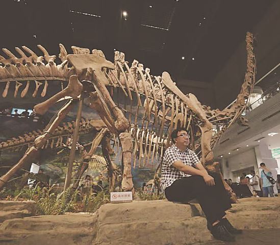 科幻作家何夕在自貢恐龍博物館的恐龍化石前