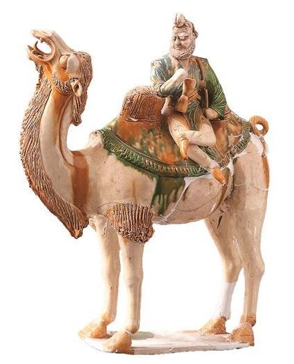盛唐時期,許多外國人定居中國境內(nèi),不少人落戶長安。他們從事各種職業(yè),其中一些人甚至在朝廷中擔(dān)任要職。唐代墓葬陶俑中經(jīng)常出現(xiàn)外國人的形象,是這一時期社會風(fēng)貌的真實寫照。三彩胡人騎駝奏樂俑出土于西安市長安區(qū)。騎在駱駝上的胡人樂師鼻梁高聳,胡須濃密,身穿長袖翻領(lǐng)長袍,足蹬尖頭鞋,側(cè)身而坐,雙手各持一支鼓槌,胸前系著一面鼓,仿佛隨時準(zhǔn)備擊鼓伴奏、高歌一曲。駱駝頭部高揚,張口嘶鳴,似與樂師和鳴。這件充滿動感的文物,生動塑造了胡人樂師的形象,印證了絲路文化交流。