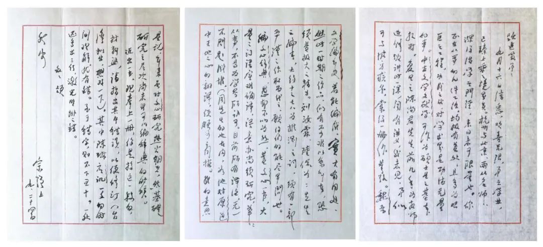 躍進(jìn)賢弟:九月十六日信悉,歡喜無(wú)限。弟之學(xué)業(yè),已臻上乘之境界矣。杭州與北京,兩從名師,深得治學(xué)之門徑,來(lái)日未可限量也。你正在從事的幾件工作,均極有益處,且多為艱巨之工程,功成之后,對(duì)學(xué)術(shù)界是功德無(wú)量的事?!吨泄盼膶W(xué)文獻(xiàn)學(xué)》可作為碩士生之基本教材。復(fù)旦之陳尚君先生,前幾年為教師進(jìn)修班講此一課,聞?dòng)兄v義,我未見(jiàn),弟似可與彼方聯(lián)系,索得一冊(cè)作參考?!段簳x南北朝文學(xué)編年史》若能編成,實(shí)大有用處。然此一時(shí)期之作品,似有不少難以系年者,恐須費(fèi)極大之精力。劉汝霖、陸侃如二先生之編書(shū),大約十之七八為推測(cè)之詞,須有一部嚴(yán)謹(jǐn)之大作取而代之,愿你們的能盡早問(wèn)世。