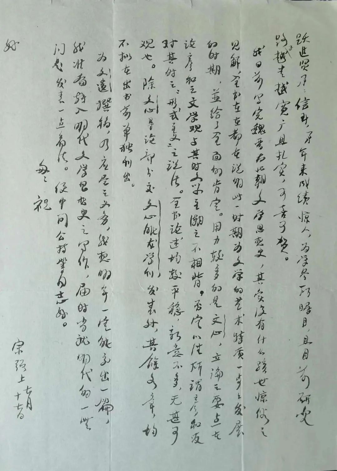 躍進(jìn)賢弟:信到。弟年來(lái)成績(jī)驚人,為學(xué)界所矚目,且目前研究路子越走越寬廣且扎實(shí),可喜可賀。我日前寫(xiě)完《魏晉南北朝文學(xué)思想史》,其實(shí)沒(méi)有什么駭世驚俗之見(jiàn)解,全書(shū)都在說(shuō)明此一時(shí)期為文學(xué)的藝術(shù)特質(zhì)一步步發(fā)展的時(shí)期,并給了全面的肯定。用力較多的是《文心》,立論之要點(diǎn)在論彥和之文學(xué)觀與其時(shí)文學(xué)主潮之不相背,否定以往所謂彥和反對(duì)其時(shí)之“形式主義”之說(shuō)法。全書(shū)論述均較平穩(wěn),新意不多,無(wú)甚可觀也。除《文心》導(dǎo)論部分交《文心雕龍學(xué)刊》發(fā)表外,其余各章均不擬在出書(shū)前單獨(dú)刊出。為《文遺》撰稿,乃應(yīng)盡之義務(wù),我想明年一定能交出一篇,我準(zhǔn)備轉(zhuǎn)入明代文學(xué)思想史之寫(xiě)作,屆時(shí)當(dāng)就明代的一些問(wèn)題發(fā)表一點(diǎn)看法。便中問(wèn)公持等同志好。