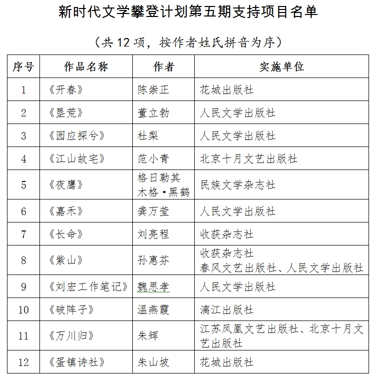 中國作家協(xié)會新時代文學攀登計劃第五期共收到申報項目91個。經評審委員會評審,并報中國作家協(xié)會書記處批準,確定12個項目入選。