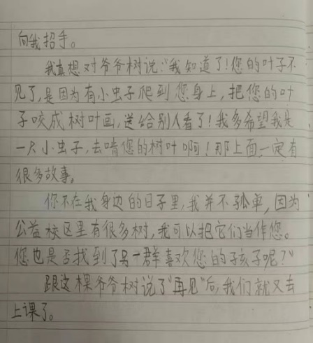 您每天一有事情就寫(xiě)成一篇故事,楓楊樹(shù)的樹(shù)干上都是爬山虎,而且還發(fā)現(xiàn)了很多秘密,我就是其中的一枝。因?yàn)樗。乙残?,而且這根枝旁邊還有很多枝,就像我有那么多的同學(xué)一樣。您就是我們的老師,給我們上故事課、上寫(xiě)作課。我想抱抱您對(duì)您說(shuō):“爺爺辛苦了!”我還想和您交談交談您還是小苗的時(shí)候的事情,因?yàn)槟鷮?xiě)的《烏丟丟的奇遇》太童話(huà)了,我要聊聊到底有沒(méi)有這件事情。