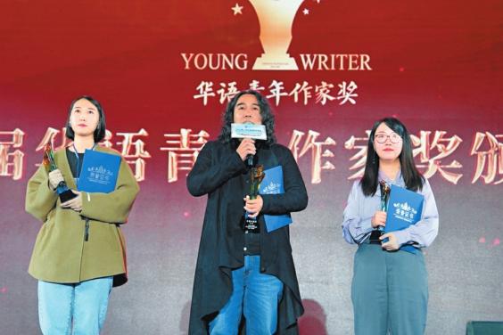 顧拜妮、包倬、龔萬瑩(從左至右)領(lǐng)取第九屆華語青年作家獎“中篇小說獎”。