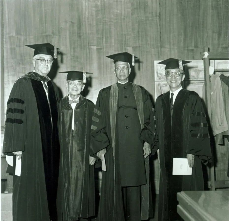 1959年第三屆“東西方哲學(xué)家會議”,胡適(右一)、鈴木大拙(左二)和拉達(dá)克里希南(右二)被夏威夷大學(xué)授予名譽(yù)博士學(xué)位