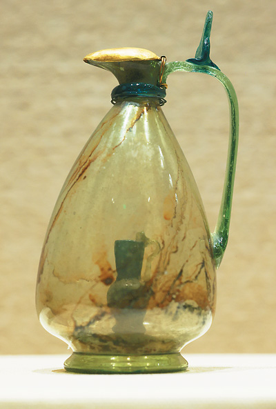 在遼寧省博物館“山河與共——遼金歷史文化主題文物展”現(xiàn)場(chǎng),一個(gè)精美的遼代玻璃瓶吸引不少觀眾駐足欣賞。此瓶出土于遼寧省朝陽市北塔,輕薄晶透,瓶口似鳥首,柄柱似鳥尾,整體猶如一只昂首蹲坐的小鳥,瓶中還有一長(zhǎng)頸弧腹小瓶,設(shè)計(jì)十分巧妙。據(jù)介紹,這件玻璃瓶產(chǎn)自波斯(今伊朗),反映了遼與西亞的經(jīng)貿(mào)文化交流。