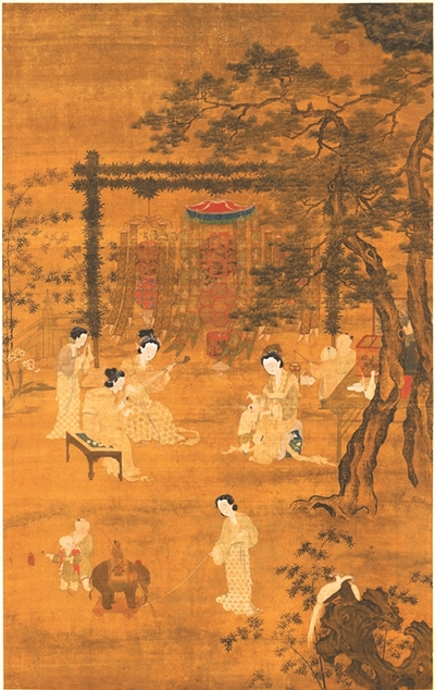 宋人李嵩的《觀燈圖》(臺(tái)北故宮博物院藏)描繪了婦孺兒童元宵夜宴飲、樂賞燈戲的場景。李嵩是宮廷畫家,山水、人物、花鳥樣樣在行。這幅《觀燈圖》的背景似是一富貴人家的后院花園之中,蒼松翠竹,芳草萋萋,曲橋護(hù)欄,花燈懸空,璀璨絢麗,嶙峋的怪石上立有一對(duì)五彩雉雞。居于畫面中央的是4位衣著典雅的仕女,左邊3位正在彈奏樂器,站立者正奏檀板,兩位坐著的仕女一位吹簫、一位橫彈琵琶。這種橫彈琵琶的方式,今天只在泉州南音中可以得見。右邊的仕女正在逗孩童,她身后還有兩位童子,手上各提一盞燈,其中一盞做成兔子的樣子,頗有童趣。旁邊的方桌上,擺著酒壺、碗碟,還有一盞走馬燈。