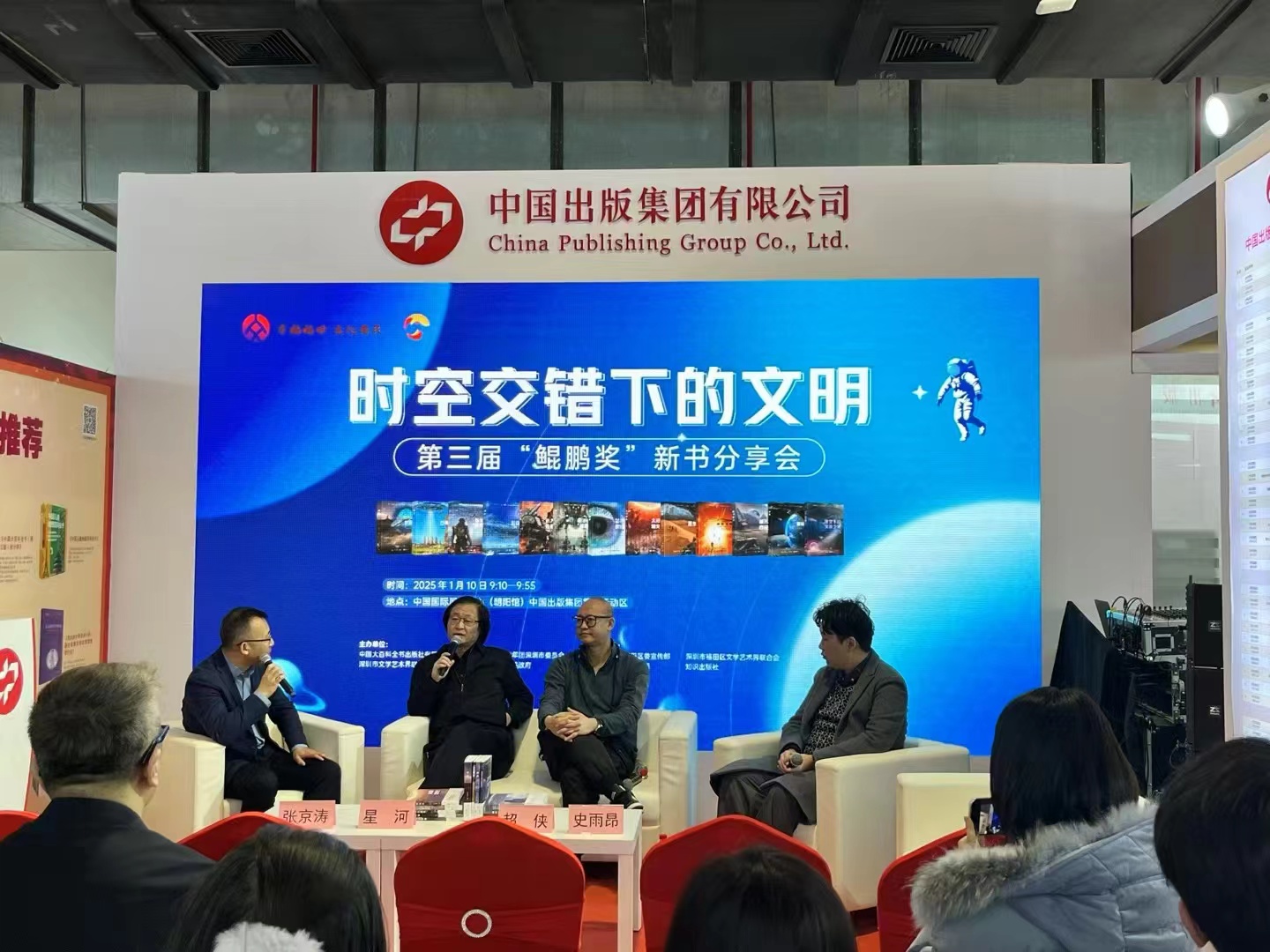 1月10日,“時空交錯下的文明:第三屆‘鯤鵬獎’新書分享會”在第37屆北京圖書訂貨會上舉行。中國作家協(xié)會科幻文學委員會委員、中國科普作家協(xié)會常務理事、科學文藝專業(yè)委員會主任星河,“鯤鵬獎”獲得者史雨昂等與會?!蚌H鵬獎”獲得者歐陽子毅和徐煒軒以視頻的方式參加活動?;顒佑芍R出版社常務副社長張京濤主持。
