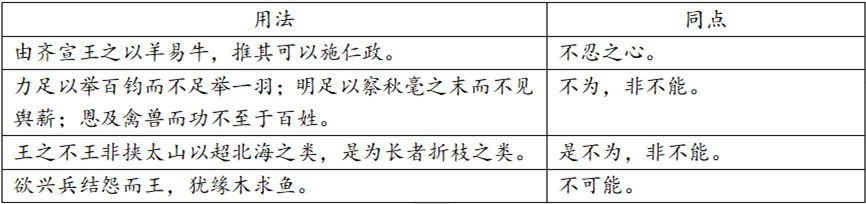論述齊宣王之“不王”是不為而非不能。孟子舉有人能“舉百鈞”而不能“舉一羽”,能“察秋毫”而不能“見輿薪”為例,說明“不為也,非不能也”的道路。齊宣王還不能理解,于是孟子又舉“挾泰山以超北?!迸c“為長者折枝”為例進(jìn)一步說明。兩問兩答,兩次取譬,同時(shí)進(jìn)行反詰,詞鋒犀利,使對(duì)方明確“不王”的癥結(jié)所在。