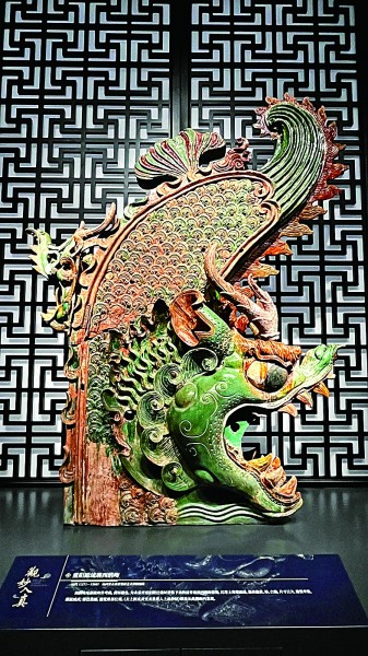展覽現(xiàn)場(chǎng),蔚為壯觀的要數(shù)高3.06米、長(zhǎng)17米的永樂宮三清殿琉璃鴟吻與正脊。山西省古建筑與彩塑壁畫保護(hù)研究院副院長(zhǎng)安海介紹說,這是本次展覽中體量最大、重量最大、搭建難度最高的一件文物。釉色艷麗、造型特殊、氣勢(shì)浩大的鴟吻由七塊琉璃拼合而成,以紅坩土作胎,呈孔雀藍(lán)釉色,在造型上作盤曲狀,張口吞脊,身上塑胡人獻(xiàn)寶、風(fēng)伯、雨神、流云等紋樣。兩只高大的孔雀藍(lán)琉璃鴟吻原位于屋頂正脊兩端,遷建永樂宮時(shí)被替換下來,保存在文物庫(kù)房里。從文物價(jià)值上講,永樂宮三清殿琉璃堆花龍鳳脊以華美之態(tài)創(chuàng)后世堆花脊簡(jiǎn)之先河,代表了元代琉璃藝術(shù)的最高成就。