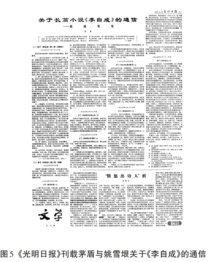 第二處,是茅盾提及了《光明日?qǐng)?bào)》1977年6月25日刊載的《關(guān)于長(zhǎng)篇小說<李自成>的通信》。這篇文章,是基于《李自成》第二卷上下冊(cè)出版的推介評(píng)論。1977年2、3月間(版權(quán)頁落款為1977年1月),《李自成》第二卷由中國(guó)青年出版社裝訂發(fā)行[11]94-95。茅盾于丁巳年正月初二(1977年2月19日)致王亞平信札時(shí),就對(duì)《李自成》的文學(xué)評(píng)價(jià)有自己的“期待”,“《李自成》第二卷第一冊(cè)問世,是一件大事,但愿文學(xué)刊物盡快評(píng)介,不知今日寫文學(xué)評(píng)論者有無余暇顧及此否?此所謂余暇,即在工農(nóng)兵作品之余,有無時(shí)間乃至興趣注意一個(gè)老作家所寫的長(zhǎng)篇(其長(zhǎng)恐必空前,因?yàn)槲覀兌贾廊珪8牛v史小說也?!盵6]120 《光明日?qǐng)?bào)》、新華社很快都聚焦到《李自成》這部長(zhǎng)篇?dú)v史小說,3月時(shí)新華社曾以中國(guó)新聞社的名義“用六種文字向海外報(bào)道了《李自成》的出版消息,又安排香港《新晚報(bào)》自三月廿七日起連載第一卷。本月中旬又向海外發(fā)了一篇約四千字的‘訪問記’,已經(jīng)同時(shí)在香港《大公報(bào)》、《文匯報(bào)》、《新晚報(bào)》以及《澳門日?qǐng)?bào)》發(fā)表”[11]106?!豆饷魅?qǐng)?bào)》于6月初動(dòng)議發(fā)表茅盾致姚雪垠的部分書信,最終這批摘錄信札由姚雪垠摘抄、茅盾校訂之后,于6月25日在該報(bào)第3版《文學(xué)》副刊第74期登載。