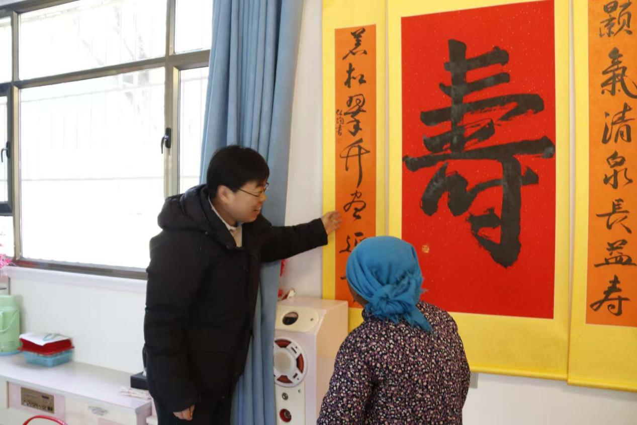 送春聯(lián)活動結(jié)束后,池溝村黨支部組織走訪慰問村內(nèi)八十周歲以上老年人,為他們送去書法名家創(chuàng)作的中堂壽聯(lián)和米、油等生活用品。每到一戶,走訪人員都與老人傾心交談,陪他們嘮家常,關(guān)切詢問老人的日常生活、健康狀況,并和家人共同把中堂壽聯(lián)掛好,向老人介紹中堂壽聯(lián)創(chuàng)作及作者情況,轉(zhuǎn)達來自千里之外的祝福,為老人祝壽添福,以詩詞壽聯(lián)、中堂書法獨特的文化韻致,德化人心、滋養(yǎng)家風(fēng),傳揚尊老敬老愛老的傳統(tǒng)美德。