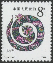 新中國(guó)郵票史上的第一輪生肖郵票,是從1980年的“庚申猴年”開(kāi)始的。到了“蛇年”,中國(guó)郵政發(fā)行了《己巳年》特種郵票。在畫(huà)面中,一條金色的蛇蜿蜒成圓,它的身體纏繞著牡丹、荷花、菊花和梅花等四季之花,呈現(xiàn)出歲月流轉(zhuǎn)之感。這條蛇口含靈芝,從而減少了人們對(duì)蛇的本能畏懼,且增添了健康長(zhǎng)壽的寓意。時(shí)間荏苒,如今,作為第四輪蛇生肖郵票的《乙巳年》問(wèn)世了。這幾輪的蛇生肖郵票,均寓意祥云普照、好運(yùn)長(zhǎng)久、福納百祥。