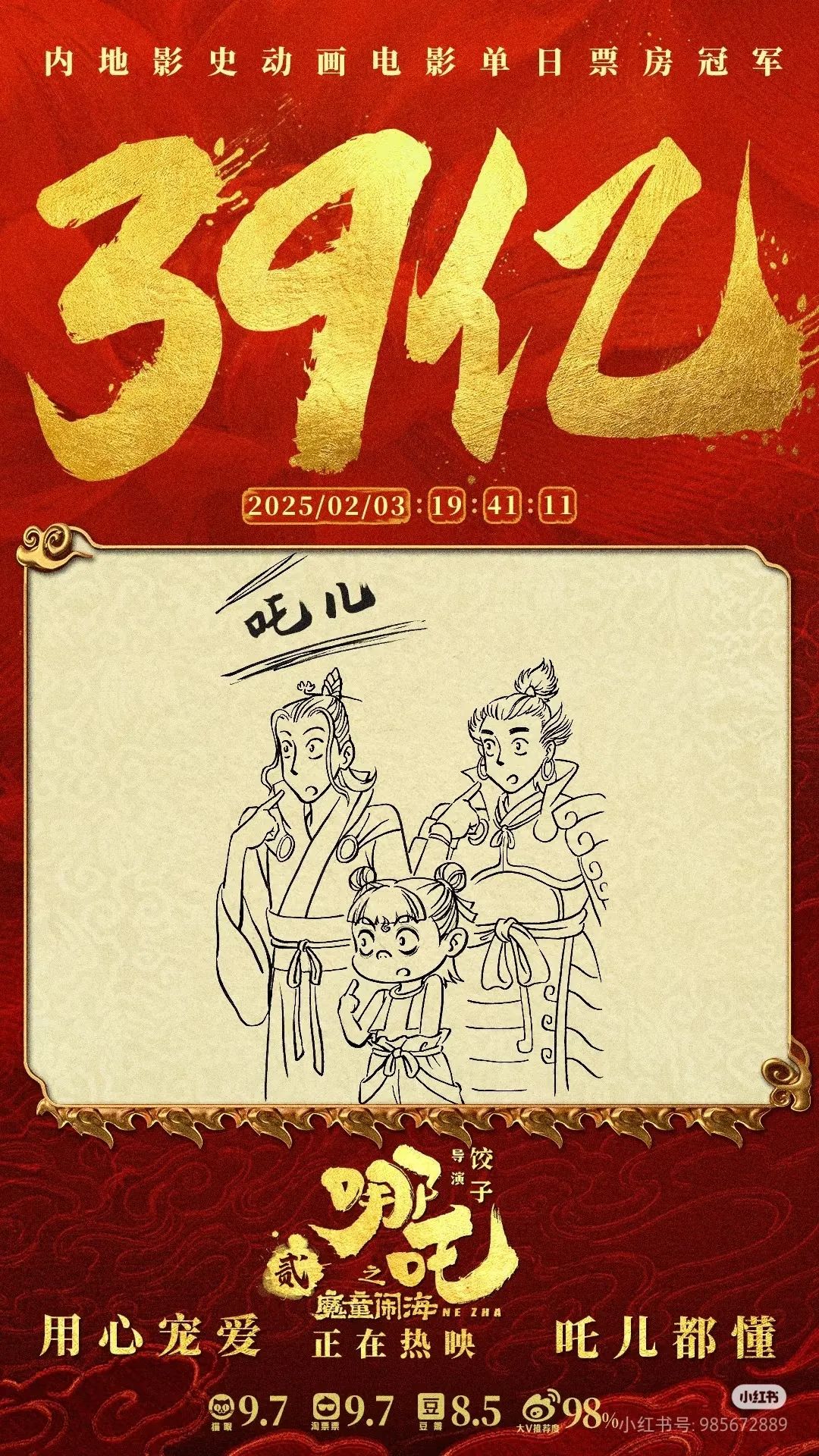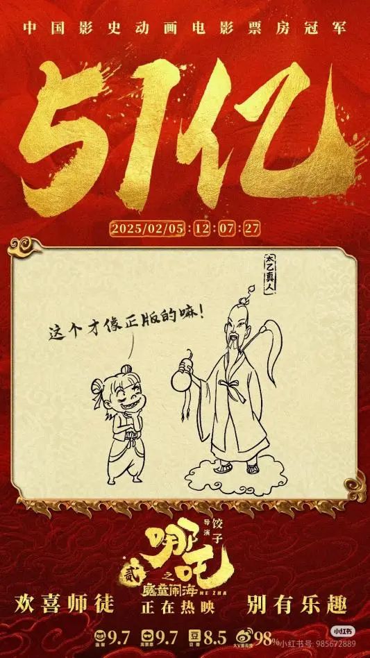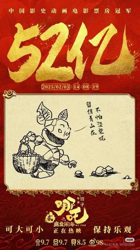 2025年春節(jié)期間,六部前期宣傳頗豐、影迷期盼已久的“重磅電影”同時上映,被稱為史上最強(qiáng)春節(jié)檔,競爭激烈可想而知。暌違五年,與偵探推理、神話史詩、武俠、軍事等各路強(qiáng)悍IP同場競技,作為中國影史動畫票房冠軍續(xù)作的《哪吒之魔童鬧?!穭萑缙浦?,粉碎“續(xù)作難出佳作”的魔咒,續(xù)寫了中國動畫影史的神話。據(jù)燈塔專業(yè)版數(shù)據(jù)顯示,截至2月6日,影片票房已突破58億元,超過《長津湖》成為中國影史票房第一,同時成為中國影史春節(jié)檔票房冠軍。與此同時,數(shù)據(jù)仍在不斷翻新當(dāng)中,有網(wǎng)友戲稱,“吒兒的含金量還在不斷上升”,一盞茶的工夫,紀(jì)錄就有可能以億元為單位被不斷刷新。影片制作方之一彩條屋影業(yè)小紅書官方號甚至成為眾多影迷、網(wǎng)友“喊話”餃子導(dǎo)演的留言板,“正是拼的年紀(jì),不能躺,快起來開拍哪吒三啦”。