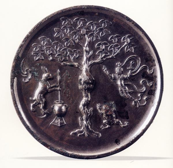 圓形月宮鏡畫面組合的另外一種形式為:左嫦娥,中桂樹(shù),右玉兔(蟾蜍),這種組合形式的月宮鏡發(fā)現(xiàn)數(shù)量相對(duì)較少。