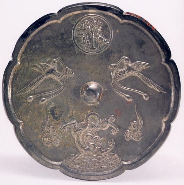 唐代的真子飛霜鏡,因鏡上田字格中的四字銘文而得名。鏡背上部中央為祥云托月,半個(gè)月亮若隱若現(xiàn)。也有人認(rèn)為,鏡子上方的半圓形紋飾不是月亮,而是太陽(yáng)的形象。鏡鈕形制較為奇特,是一只烏龜伏于荷葉之上。鏡鈕一側(cè),一位隱士“獨(dú)坐幽篁里,彈琴?gòu)?fù)長(zhǎng)嘯”。另一側(cè)則是一只鸞鳥(niǎo)獨(dú)立石上。