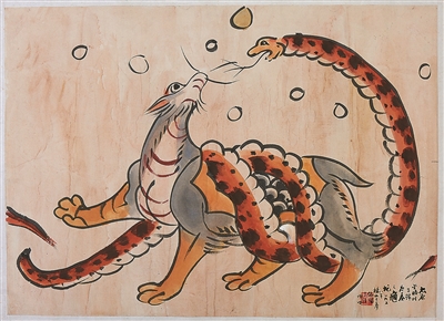 墓葬壁畫為了解古代社會提供了珍貴的圖像材料。礦物質(zhì)顏料繪制的壁畫顏色經(jīng)久不褪,畫中的蛇或出現(xiàn)在神話傳說場景里,或與人間煙火相伴,反映了古人豐富的想象力和精神信仰。山西忻州九原崗北朝壁畫墓中發(fā)現(xiàn)了鳥銜蛇和神獸銜蛇的圖案,象征著驅(qū)除升天途中的邪障,護(hù)佑墓主順利升天?!渡胶=?jīng)》記載:“大荒之中,有山名曰北極天柜,海水北注焉……又有神,銜蛇操蛇,其狀虎首人身,四蹄長肘,名曰強(qiáng)良?!便暽邎D出現(xiàn)在墓葬中,也有鎮(zhèn)守墓室、庇護(hù)墓主人安寧的意義。山西右玉寶寧寺明代“大威德焰發(fā)德迦明王”水陸畫中的蛇形象與神佛相伴,庇佑人間。蛇在畫中不僅是一種裝飾,更體現(xiàn)了古人的精神寄托,希望借助蛇的神秘力量驅(qū)邪避災(zāi),保佑風(fēng)調(diào)雨順、國泰民安。