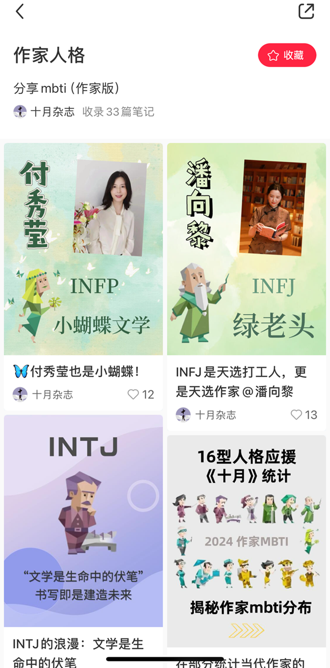 《十月》雜志小紅書“作家人格”分組頁面
