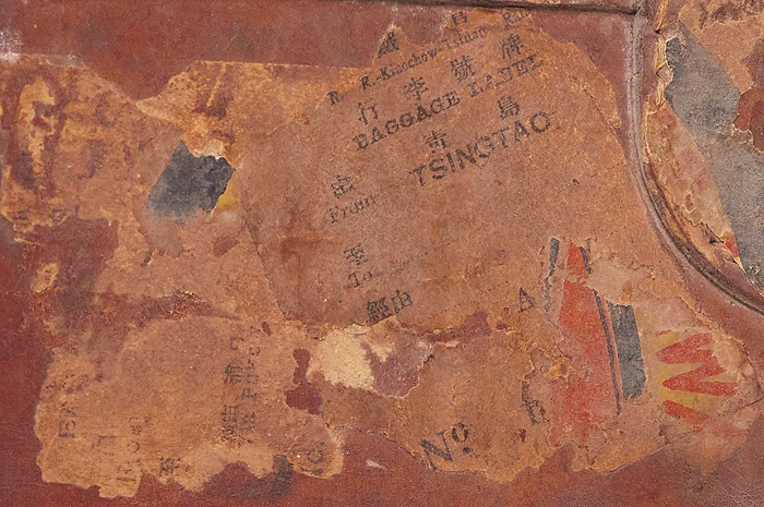 皮箱側(cè)面局部放大可見“BAGGAGE LABEL”,“由”(from)和“青島”(TSINGTAO)字跡