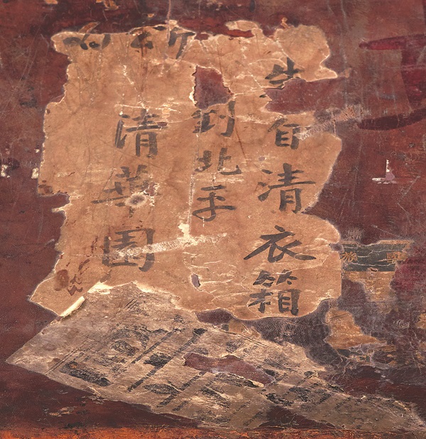 朱自清衣箱的形制是歐式的,國外工藝,使人自然聯(lián)想到朱自清留學(xué)歐洲的情形。朱自清衣箱正面還有一處極微小的殘留,是“Pe”和“RA”。不同于前面“青島”“膠濟鐵路”的中外文對照,這兩處只有幾個外文字母,此處紙張比“青島”殘留紙張年代更久。