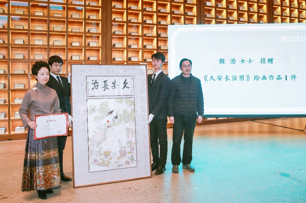 作為戴老的入室弟子,程澄將新近精心繪制的《久安長治圖·白娘子》捐贈予杭州國家版本館。圖中白娘子溫婉柔美,牡丹、桂花等名花異卉寓意富貴祥瑞、前程錦繡,九只鵪鶉則諧音“久安”,全圖充分表露出對于偉大祖國長治久安、物阜民豐的美好期盼和溫馨禱祝,生動展現(xiàn)出中國式現(xiàn)代化所呈現(xiàn)出的輝煌與璀璨。
