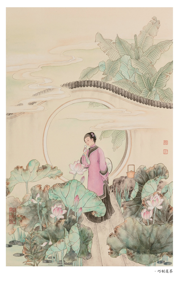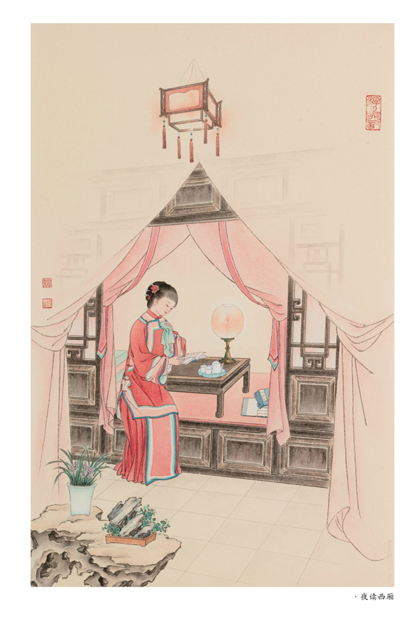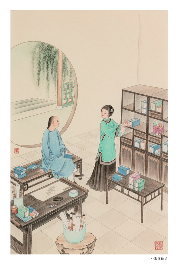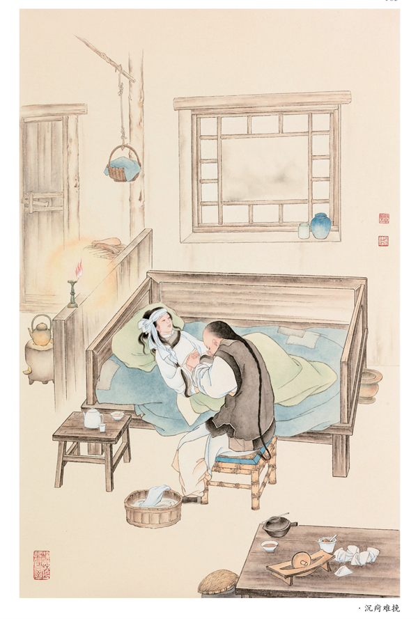 這套圖斷斷續(xù)續(xù)畫了四五年,本想去蘇州、無錫實地考察一番,但因身體和疫情原因一直未成行,中間生病又中斷了一段時間,幾次易稿。期間北京大學教授朱玉琪先生和中國人民大學國學院教授孟憲實先生看過后,提出希望有別于《紅樓夢》,更應側(cè)重于市井平民化的意見,有些部分進行了修改或重繪。老朋友章慎生先生去蘇州出差,拍一些蘇州風貌的照片發(fā)給我作素材參考。畫稿還得到了中國工筆畫學會原常務副會長、《紅樓夢》郵票設計者蕭玉田先生的指導。老先生對一些構(gòu)圖細節(jié)進行了指教,我受益良多。中國紅樓夢學會會長張慶善先生,多年來一直在工作和學習中給予我支持關照,也見證了我的成長,對于這次的作品,提出了中肯的意見,并答應幫我寫序言。我特意請沈陽大學文化傳媒學院的孫熙春師弟為此書篆刻印鑒兩方,一方為“浮生六記”四字,一方為馮老《枕上再題曹雪芹家世》詩中的一句“楝樹花開終結(jié)子”作為終結(jié)。另外我愛人王金亮先生,對我大力支持,承擔了家里的一應事情,使我能心無旁騖地專心做事。