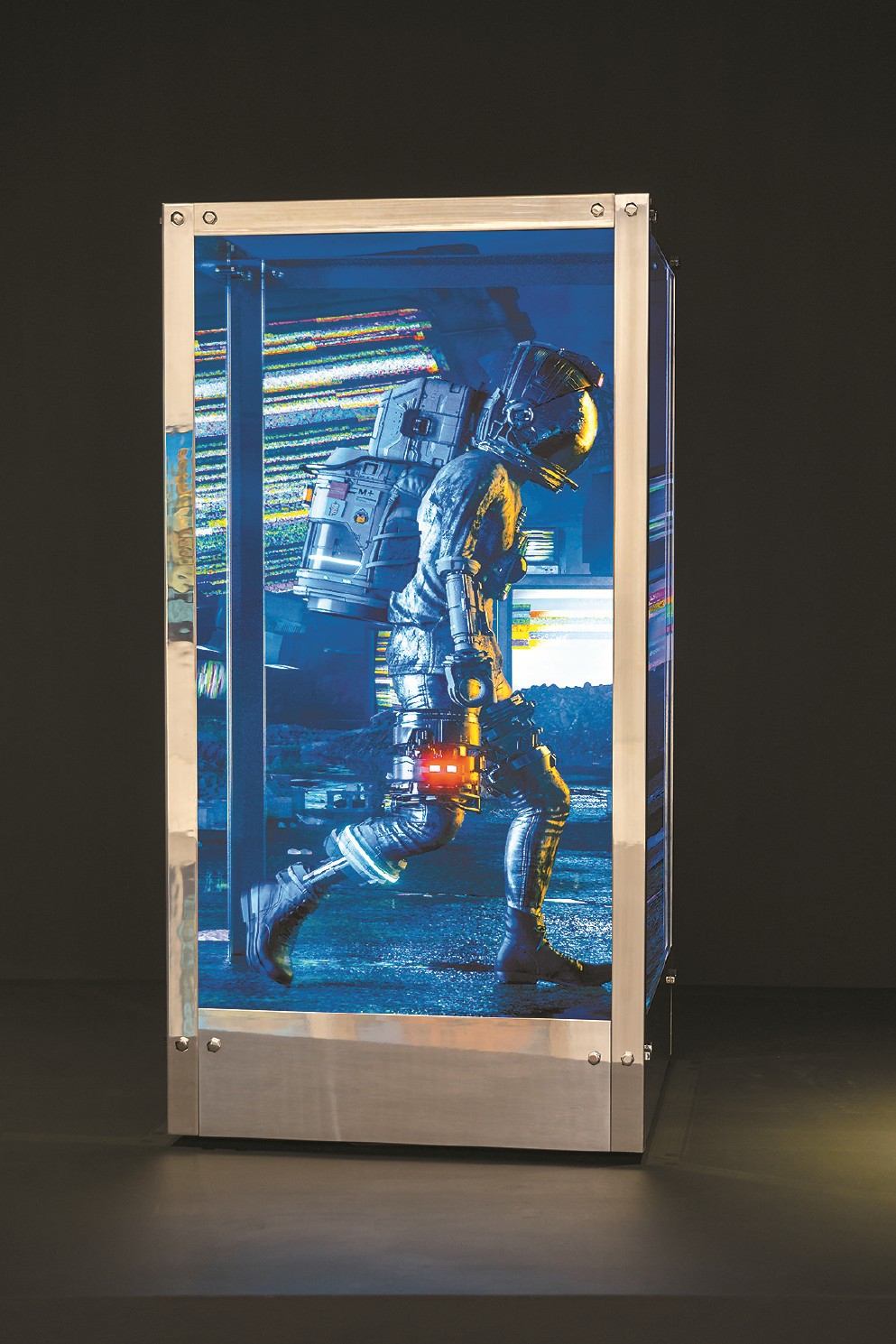 在動(dòng)態(tài)雕塑《人類一號(hào)》(2021年)過程中,Beeple試圖通過作品在美術(shù)館與博物館系統(tǒng)中的生長與巡回性展覽,來挑戰(zhàn)作品的生命長度?!度祟愐惶?hào)》是Beeple創(chuàng)作的首件動(dòng)態(tài)雕塑作品。立方體中,身著宇航服與頭盔的“旅行者”是第一位誕生于元宇宙虛擬世界的人。他于2021年10月亮相,已走過第一章“人類誕生”(佳士得紐約洛克菲勒中心藝?yán)龋?、第二章“一場持久?zhàn)”(意大利都靈利沃利城堡當(dāng)代藝術(shù)館)、第三章“兔年”(香港M+博物館)、第四章“完全消失”(美國水晶橋博物館)、第五章“奇點(diǎn):第一階段”(南京德基藝術(shù)博物館),目前正走在第六章“半人工虹”(日本東京森美術(shù)館),并將永不停歇地走在變幻無窮的虛擬景觀中。