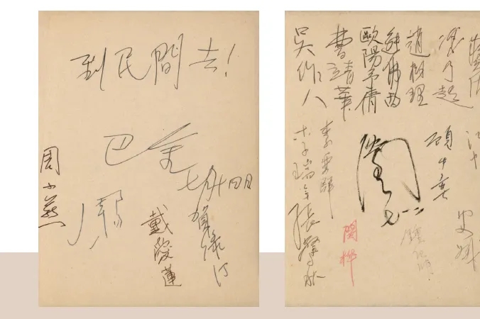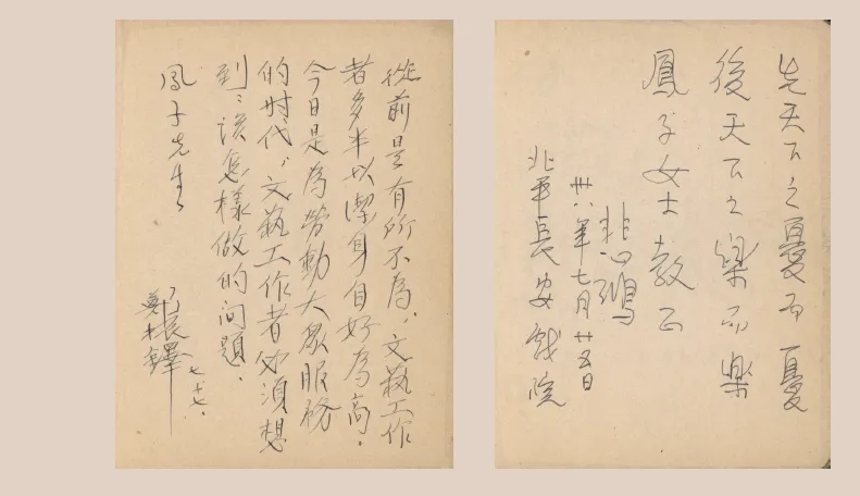 周恩來留言“為建設(shè)人民藝術(shù)而努力!鳳子姊,周恩來。七.十六。”寥寥數(shù)語,卻飽含著他對(duì)文藝家的親切關(guān)懷和對(duì)文藝事業(yè)的殷切期望。