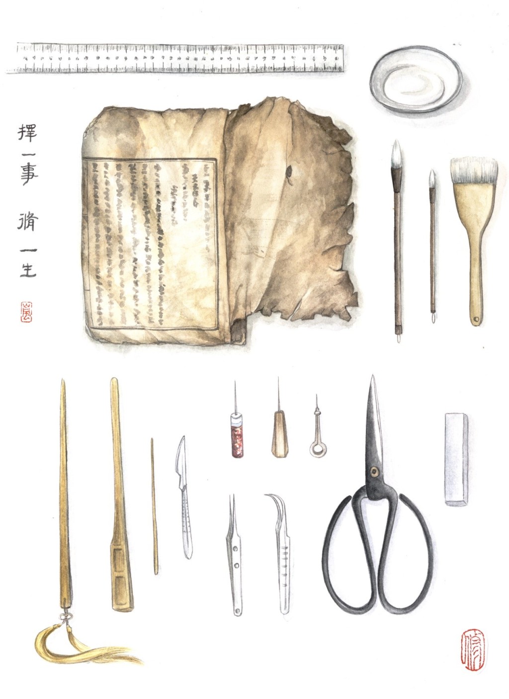 圍繞古籍文獻的保護與修復(fù),我想從劫、器、紙、修、緣五個方面分別講述破損原因、修復(fù)工具、修復(fù)用紙、修書方法和古籍保護相關(guān)文化、修復(fù)理念等。