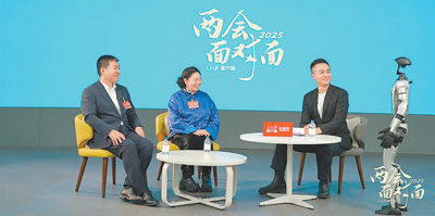 訪談現(xiàn)場,兩位嘉賓與智能機器人助手互動。(人民日報社新媒體中心供圖)