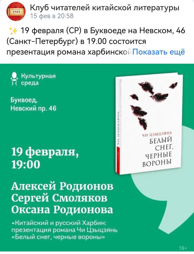 2025年2月19日,中國著名作家、中國作家協(xié)會副主席遲子建的長篇小說《白雪烏鴉》俄文版推介會在書蟲連鎖書店圣彼得堡總店成功舉行。本次活動由中國作家協(xié)會外聯(lián)部指導(dǎo),俄羅斯中國文學(xué)讀者俱樂部主辦,吸引了圣彼得堡各界30余位中國文學(xué)愛好者到場參與,同時通過網(wǎng)絡(luò)直播向全國讀者推介。