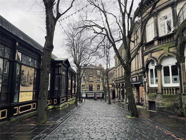 往哈羅蓋特去的火車上,窗外風景逐漸從城市轉為典型的英格蘭鄉(xiāng)村景觀,間或點綴著林地,雖已上午10點多,但冬日的晨霧還未散盡,陽光射下來,顯得頗有仙氣。哈羅蓋特給人的第一印象相當好,街道是整齊的維多利亞時期建筑,沒有礙眼的新樓房,這里曾經(jīng)連續(xù)三年被選為英國“最樂居城市”。自16世紀此地發(fā)現(xiàn)溫泉以來,這里就成了全英國聞名的療養(yǎng)地,富人們拖著病體接踵而至,也讓城市財富得以積累。一圈走下來感覺這里明顯是流淌著“老錢”的地方,當?shù)厝怂坪鯇ψ约旱某鞘袣v史非常自豪,幾乎每走幾步就會看到建筑物上掛著銘記歷史的“藍牌”——不過這兒統(tǒng)一用的是棕色底。