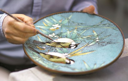 技師在為景泰藍(lán)工藝品進(jìn)行“點(diǎn)藍(lán)”。 新華社 發(fā)