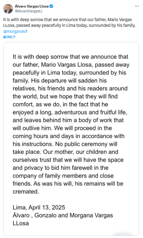 略薩的兒子阿爾瓦羅·巴爾加斯·略薩在社交媒體X上宣布了這個消息