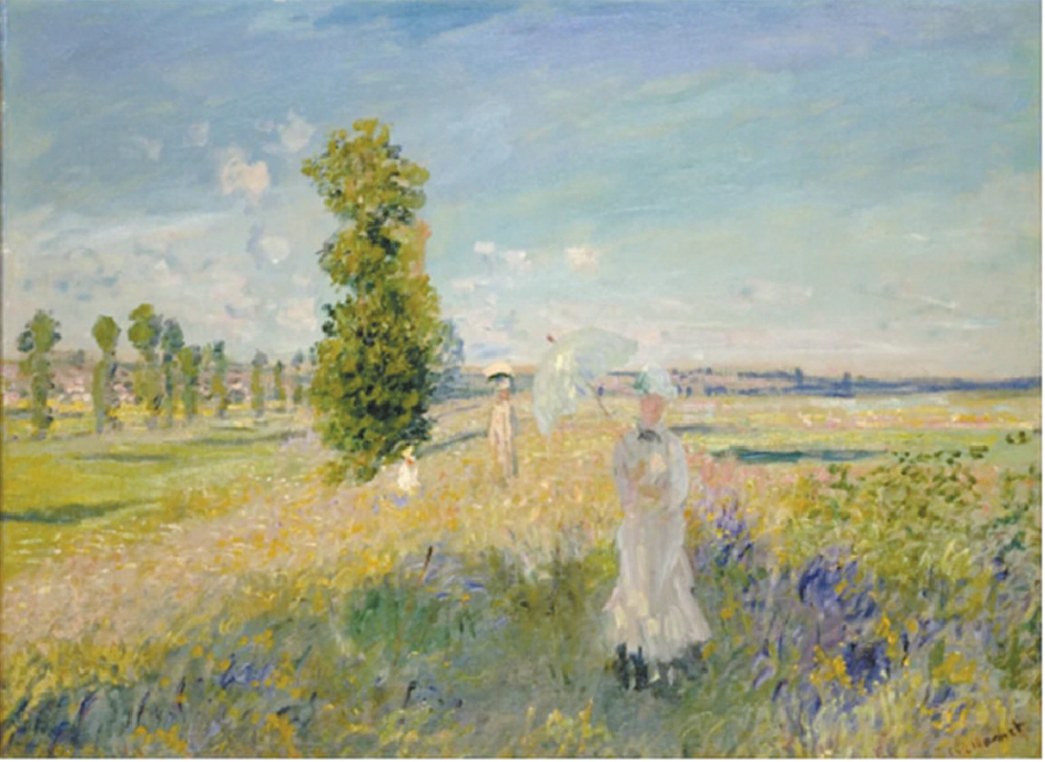《散步》創(chuàng)作于莫奈創(chuàng)作風(fēng)格成熟期,描繪了卡米爾手持陽傘,裙擺隨風(fēng)飄揚(yáng),與兒子、乳母在夏日田野中散步的溫馨場景