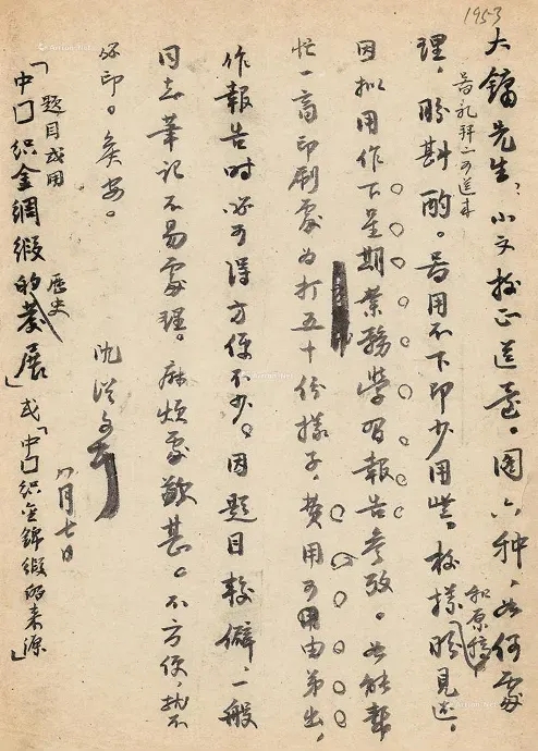 小文校正送還。圖六種,如何處理,盼斟酌。【圖禮拜二送來】[1]圖用不下即少用些。校樣和原稿盼見還,因擬用作下星期業(yè)務學習報告參考。如能幫忙□商印刷處為打五十份樣子,費用可由弟出,作報告時必可得方便不少。因題目較僻,一般同志筆記不易處理。麻煩處歉甚。不方便,就不必印。