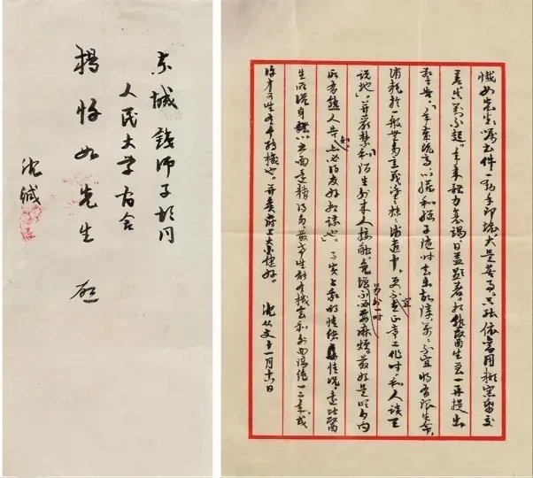 2013年12月12日由北京傳是國際拍賣有限責任公司舉辦的“十周年(2013年)秋季拍賣會”之“‘數(shù)風流人物’——近現(xiàn)代文化名人墨跡”專場拍出致楊纖如信二封,2月14日信共二紙,八行箋黑色毛筆豎寫;11月18日信共一紙,八行箋黑色毛筆豎寫。并附信封兩個,收信人信息與寄信人信息分別是“東四北張自忠路舊鐵獅子胡同人民大學宿舍 楊懺如同志”與“東堂子五十一號沈寄”,“東城鐵師子[6]胡同人民大學宿舍 楊懺如[7]先生 啟”與“沈緘”。二信輯校如下:
